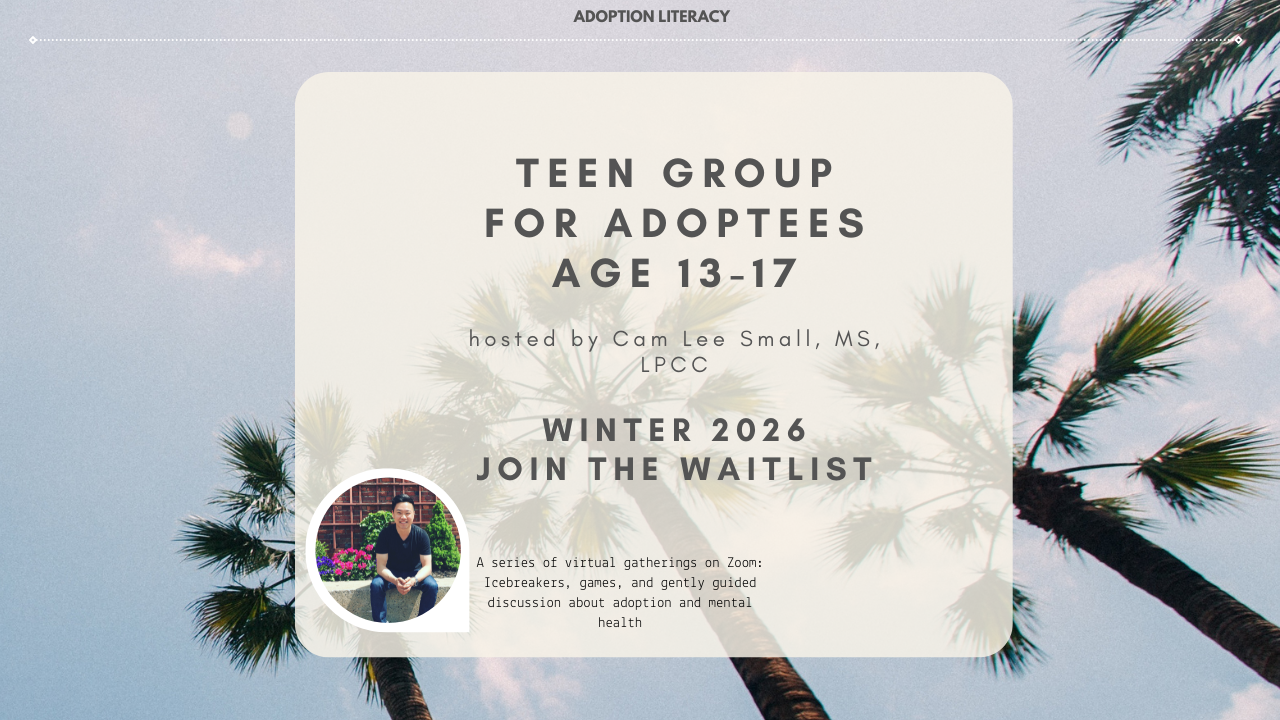 Relationship dynamics experienced in new dimensions in all ages and stages of the adoptee journey. This 6-week deep dive extends well beyond a one-and-done webinar to give you ongoing support. Includes live Q&A each week with Cam.